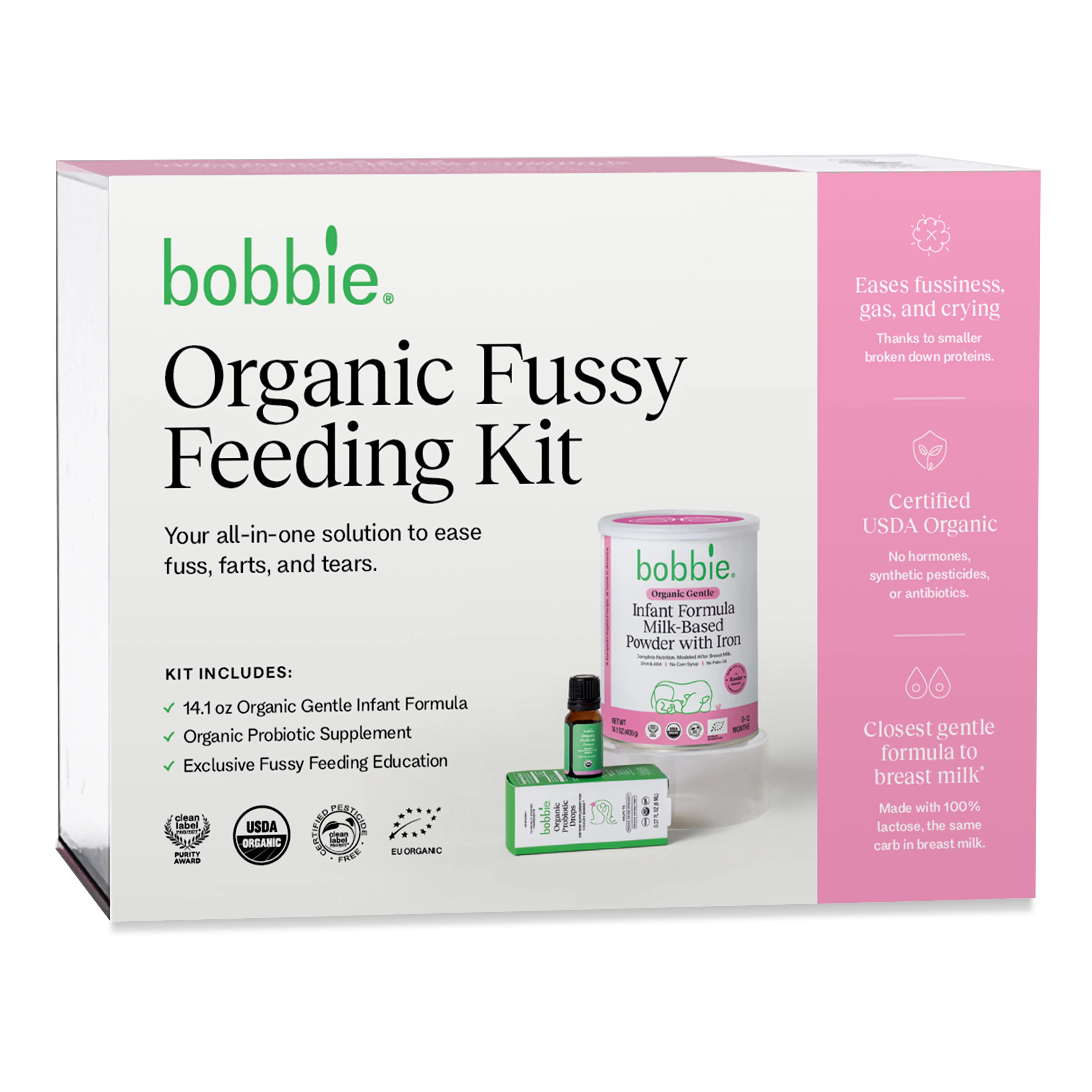 Take the guesswork out of gas. This first-of-its-kind feeding kit includes our dynamic duo that’s proven to reduce fussiness, gas and crying: a can of Bobbie Organic Gentle Infant Formula and a bottle of Organic Probiotic Drops.